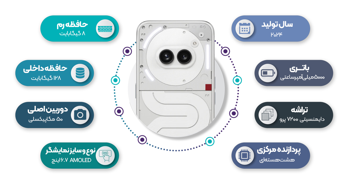 گوشی ناتینگ Phone 2a 5G با صفحه نمایش ۶.۷ اینچ AMOLED، دوربین سهگانه با لرزشگیر اپتیکال، باتری ۵۰۰۰ میلیآمپر و سختافزار قدرتمند، انتخابی ایدهآل برای کاربران حرفهای، گیمرها و علاقهمندان به عکاسی و فیلمبرداری با کیفیت بالا است. این گوشی تجربهای کامل و مدرن از کاربری روزمره و سرگرمی دیجیتال ارائه میدهد.